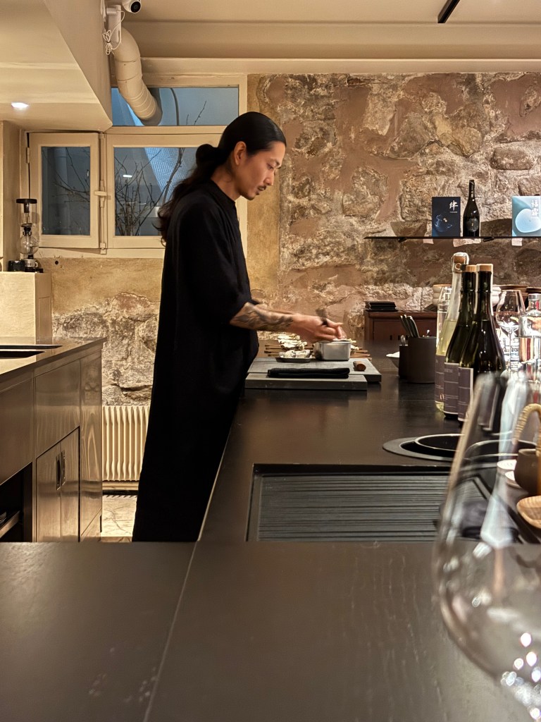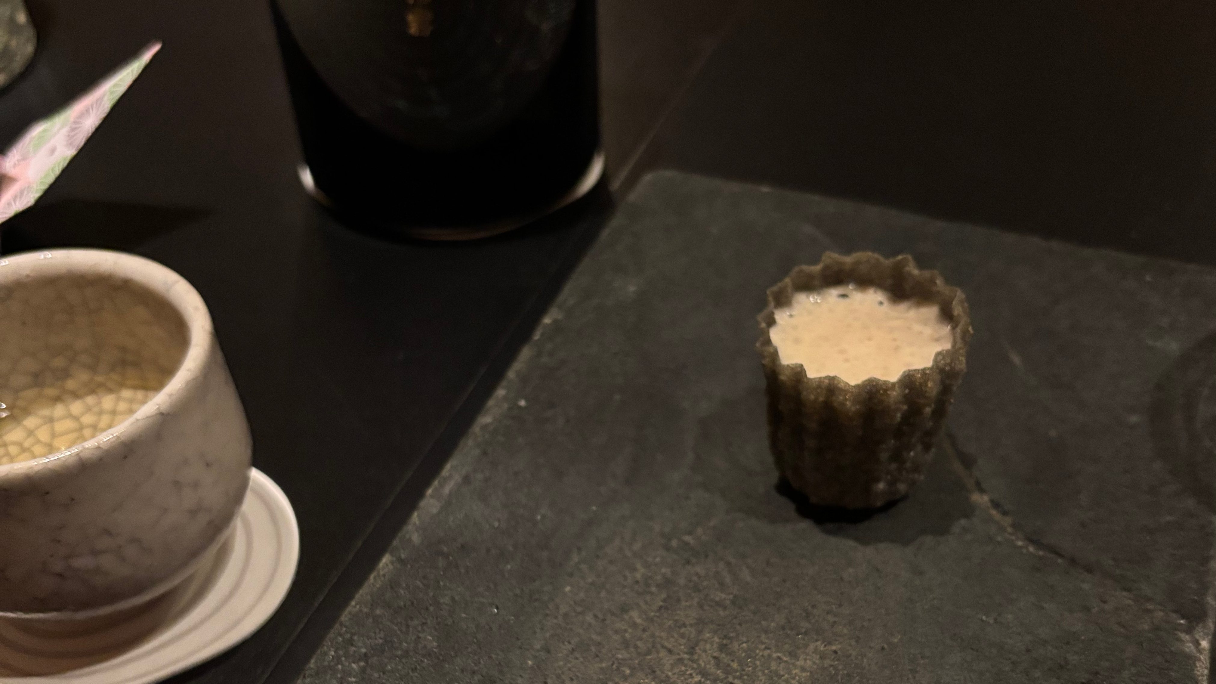 Le riz parfumé et les champignons se sont accordés à la profondeur du Ritsu servi chaud : ses arômes toastés et ses notes umami amplifient la richesse terrienne du plat. Les œufs de poisson concentrés d’iode apportaient une de vivacité à l’ensemble. Le chef Kosuke nous expliquait un peu désolé pour le choix de servir ce plat à mi-parcours du dîner alors que selon la tradition, il est censé arriver en fin de repas. Cela m’a fait sourire car ce respect sincère des codes à la japonaise témoignent d’une attention rare portée à ses convives.